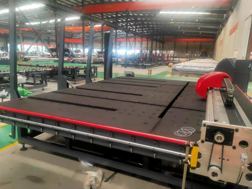 Le plan global du projet : La ligne automatique de taille du verre de commande numérique par ordinateur se compose de table de chargement automatique, table de coupure automatique et air-est flottée cassant la table. La ligne automatique de taille du verre est principalement employée dans le traitement du verre plat, qui peut rapidement et exactement charger des feuilles, pour couper le verre à ligne directe et en forme spéciale et les feuilles de rupture mécaniques air-flottées. Le flux des tâches est comme suit : La table de chargement emploie le chiffre d'affaires mécanique, par la tasse d'aspiration de vide prenant la feuille en verre du support, déposé à la table de chargement. Le verre est transporté à la table de coupure par le rouleau sur la table de chargement et la bande de conveyeur sur la table de coupure. Le support de coupeur sur la poutre de coupure de la découpeuse conduit le coupeur pour se déplacer à la grande vitesse dans la direction de X et la direction de Y par le moteur servo. Utilisant la rotation de moteur d'axe des z pour commander la trajectoire de tangente de l'outil. En même temps, la pression de coupeur et la profondeur du coupeur sont commandées par quantité analogue, et les quatre haches sont actionnées simultanément pour couper. Quand la coupe est de finition, la feuille en verre est envoyée à la table de rupture air-flottée pour traverser le coussin d'air constitué par la bande de conveyeur et la table de rupture.